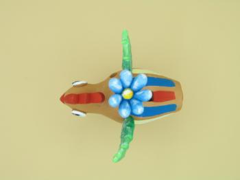 Fischietto cuccù in ceramica con base, decorato a freddo; suono bitonale.